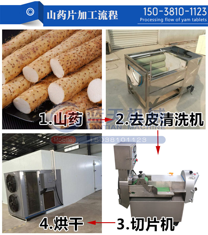 選取條直、粗壯、無腐爛、無霉變斑點的新鮮山藥放入洗滌槽中,用清水洗凈外部的泥土、沙粒等雜質,然后去皮切片。將切好片的山藥平鋪在烘盤內,推進烘房。將房內溫度加熱至50°,加熱30分鐘~1.5小時,濕度升高,注意除濕避免表面硬化,除潮的時候可以保持恒溫狀態(tài)。